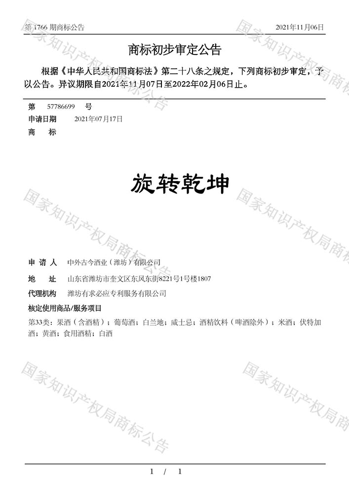 2021年11月6日,旋转乾坤酒商标获得国家商标局商标初审公告。